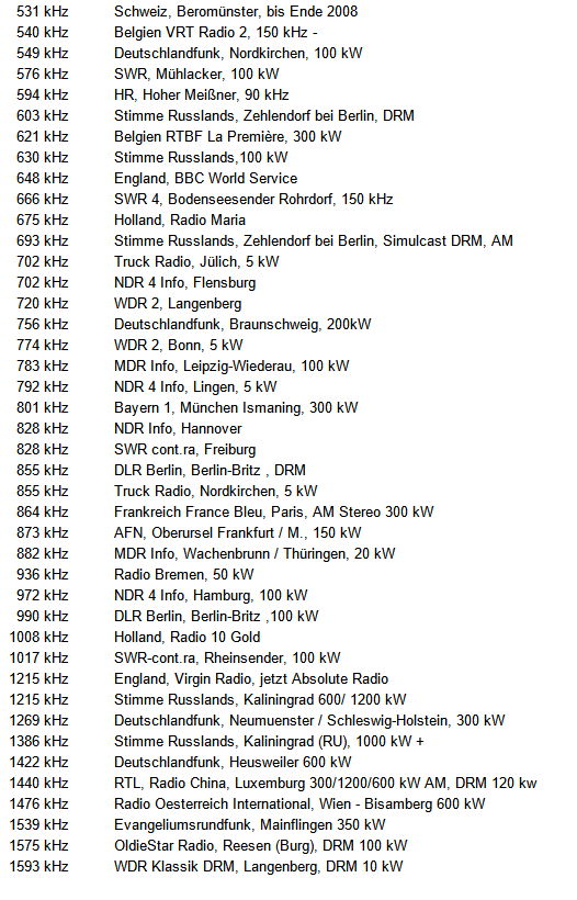 Fig. 26: Die Liste der verbliebenen Mittelwelle-Sender, wie sie sich Ende 2008 darstellte.