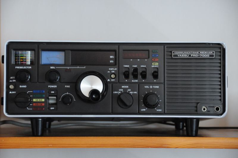 Der FRG-7000 ist auch ein sehr schöner, alter Empfänger. Er kam 1980 auf den Markt und hat gegenüber dem FRG-7 einige Verbesserungen: 2 keramische Filter für AM / SSB, der Oszillator des Produktdetektors ist nicht mehr freilaufend sondern mit 2 Quarzen versehen. Weiterhin hat der Empfänger einen nach unten erweiterten Empfangsbereich (ab 250 KHz) und eben die Digitalanzeige (nur ganze KHz). Eine zweite Digitalanzeige wird für eine Uhr verwendet. Diese letzte Anzeige ist leider bei meinem Exemplar defekt: einige Segmente bleiben dunkel...