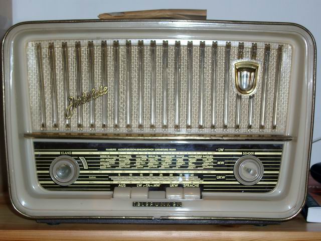 Bei "Jubilate 9" handelt es sich um ein Röhrenradio, das 1958/59 in Deutschland auf den Markt kam. Eines Tages kam meine Frau mit dem Ding an: sie hatte es auf einem Flohmarkt entdeckt und sofort an ihren Liebsten gedacht. Also gekauft und gehofft, dass es seinen Preis (38 Euro) auch Wert ist. Der Käufer hatte versichert, es liefe noch.