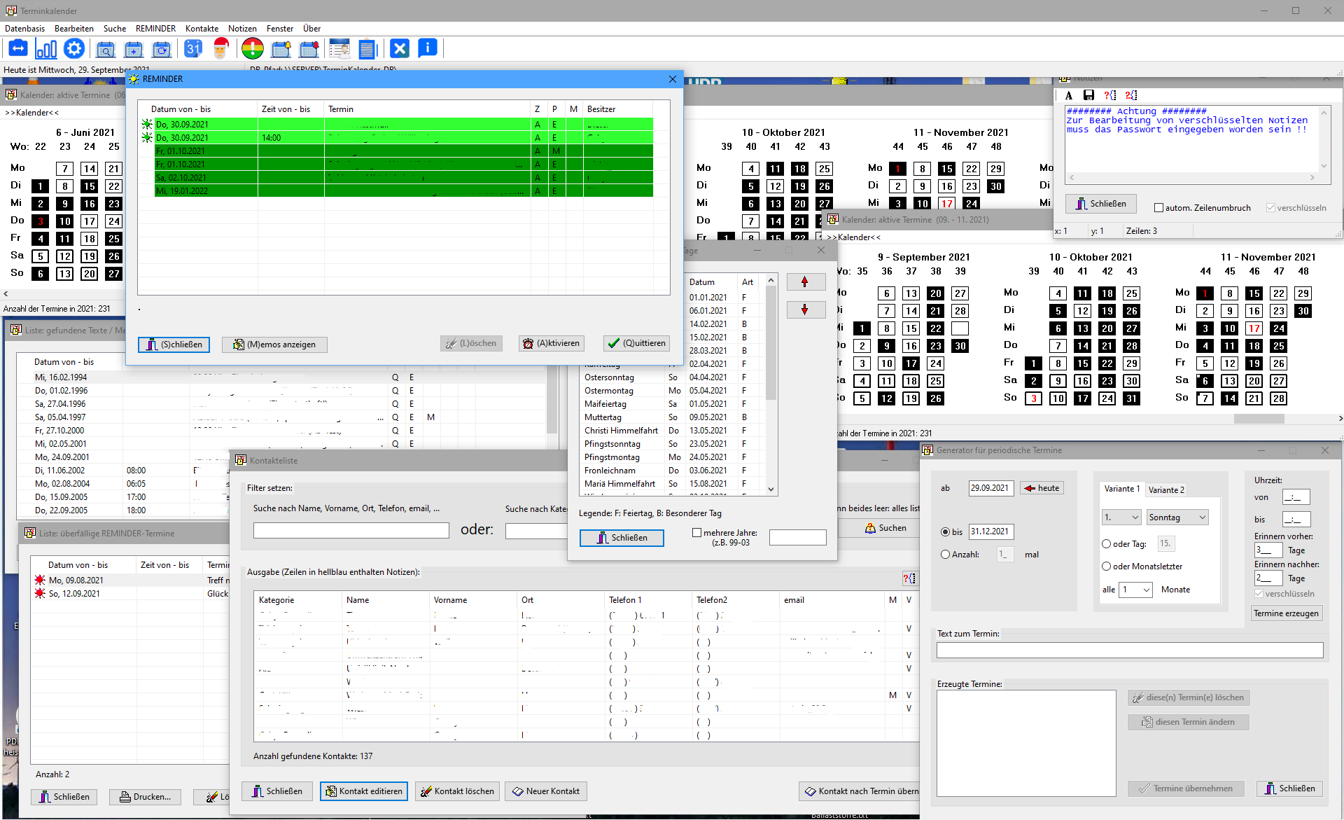 - Sie können jedem Termin ein individuelles Erinnerungsintervall zuordnen. Das Erinnerungsmodul "REMINDER" wird dann entsprechend vorher an diesen Termin erinnern